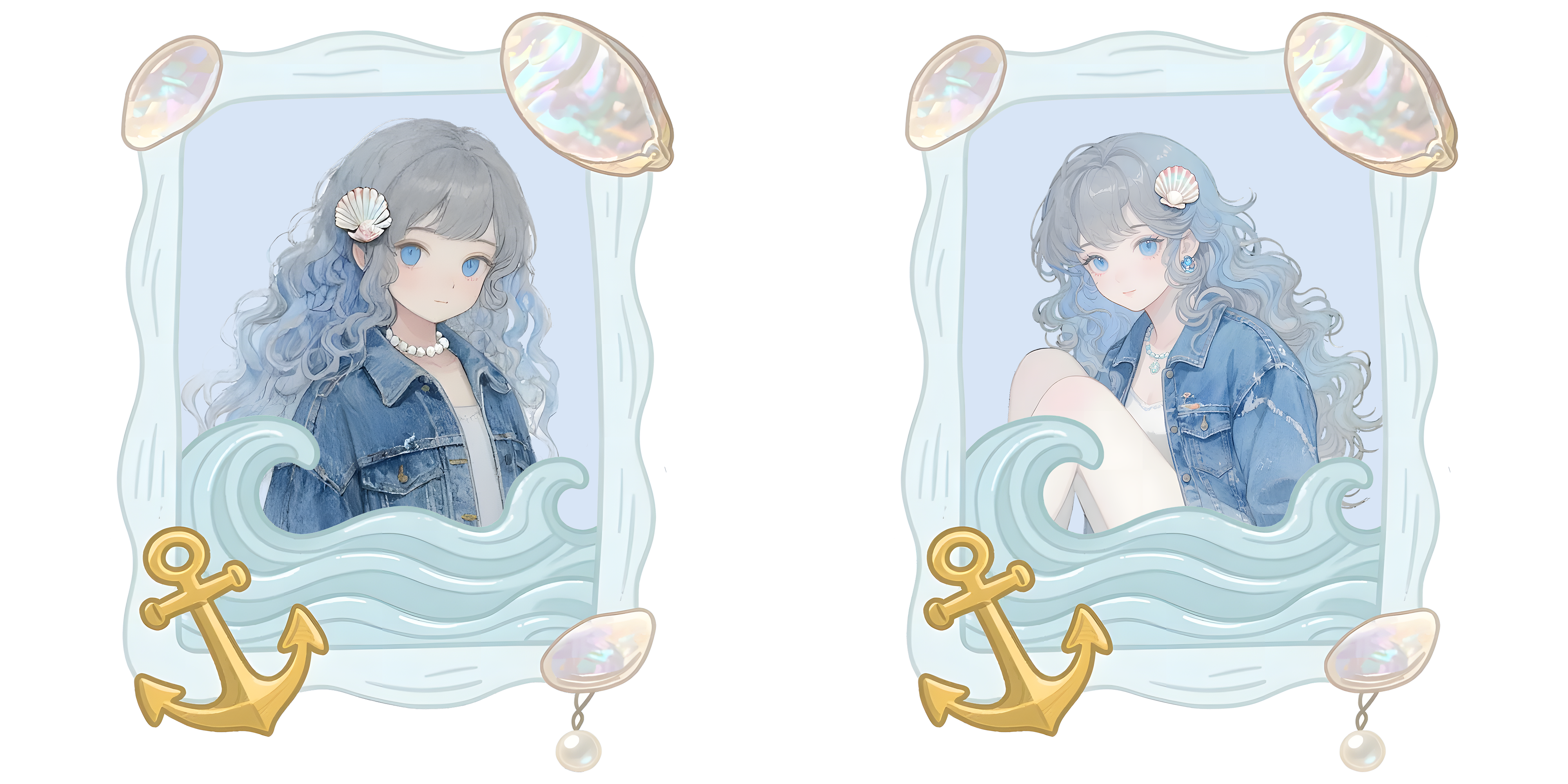 这是一场 “海洋对旅人的温柔收纳” —— 所有海洋符号化作画框的拼图,把穿着牛仔的少女,永远封存在属于她的潮汐叙事里。